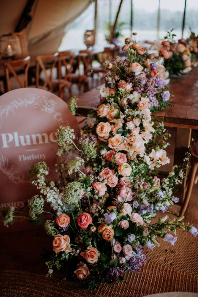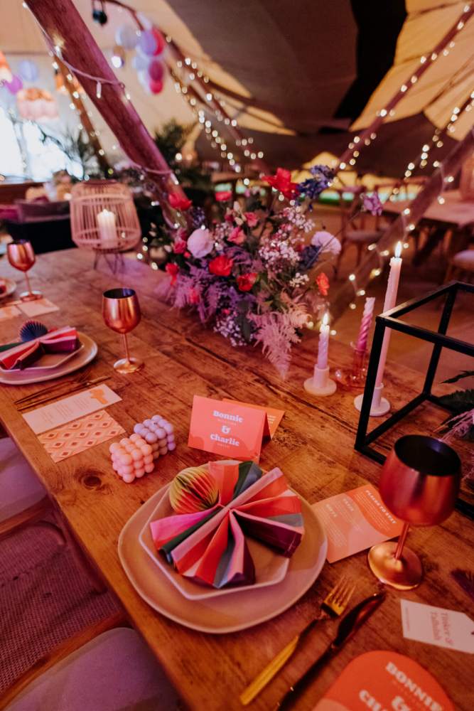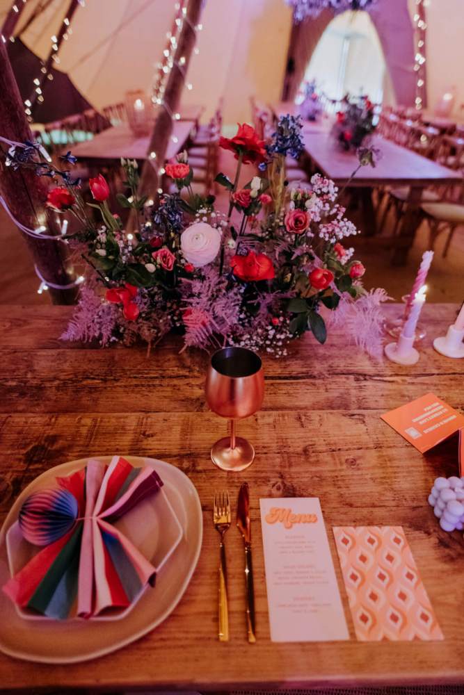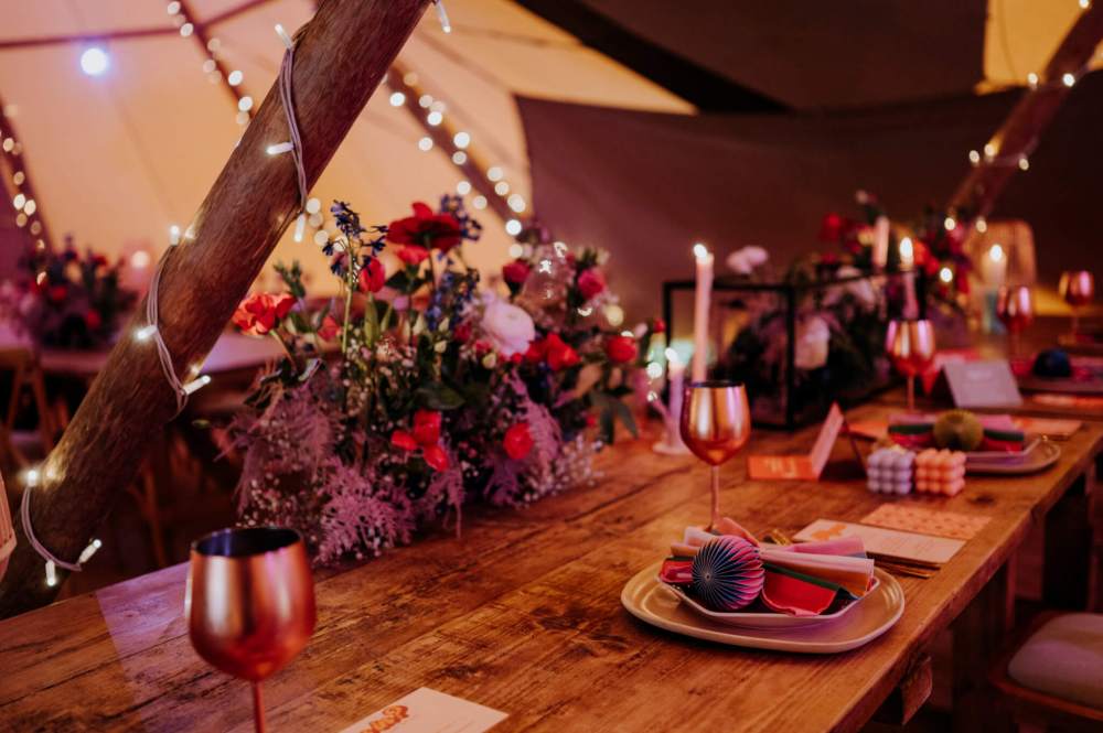 We always say that florals really do make your wedding décor come alive, and these displays created by Sarah at Plume Floristry and Laura from Blush were no exception. My advice is to go bold or go home but that doesn’t mean every single inch of the Tipi has to be decorated with florals. Sometimes, all that is needed is an eye-catching statement piece, a few simple displays and plenty of flickering candles and table lanterns.